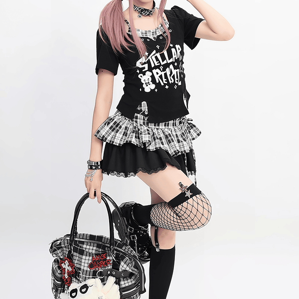 【Catwish】ショートTシャツxタンクレイヤードセット◆イラストTシャツ 地雷系 S、M、L