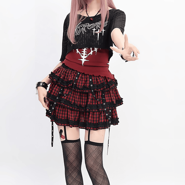 【Catwish】チェック×フリル×ベルトガーリーミニスカート◆ミニスカート サブカル系 S、M、L