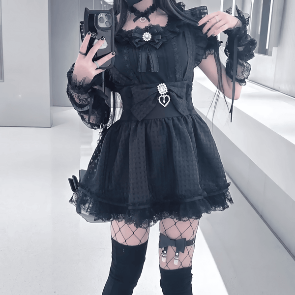 【升中味】レーススリーブチェックワンピースセットアップ◆セットアップ 地雷系 S、M、L、XL