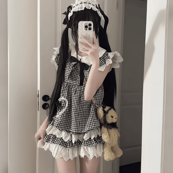 レース襟とチェック柄が主役の、地雷系クラシカルセットアップ♥ ホワイトの格子柄が映えるブラックベースのワンピースに、大きなフリルセーラー襟と繊細なレースをあしらった、地雷系・Y2Kサブカル系にぴったりのセットアップ。胸元にはビジュー付きのブローチと黒リボンがあしらわれており、華やかなアクセントに。パフスリーブには透け感のあるレース素材を使用し、甘さと軽やかさをプラス。 裾にはフリル付きのショートパンツがセットになっていて、スカート風のふんわりしたシルエットを演出しつつ動きやすさもキープ。1枚で完成する存在感あるスタイルで、イベントや写真撮影などにもおすすめのアイテムです。 ブランド名: 【AngelShare】当店イチオシのブランド!地雷系・量産型からサブカル系、ガーリー系まで、トレンドをしっかりと押さえながら、個性的で愛らしいアイテムが揃ってます。どのアイテムも高品質で、しっかりとした作りながら、デザイン性も抜群。クオリティの高さに対して価格もお手頃価格でコスパも◎!かわいさもクオリティもコスパも重要!という方におすすめのブランドです。 サイズ 衣丈 胸囲 肩幅 ウエスト M 67 84 37 68 L 68 88 38 72 XL 74 92 39 76 XXL 80 96 40 80...