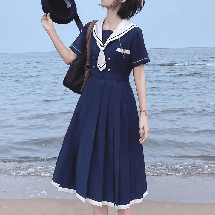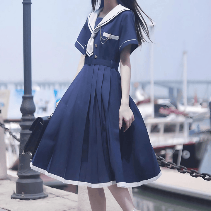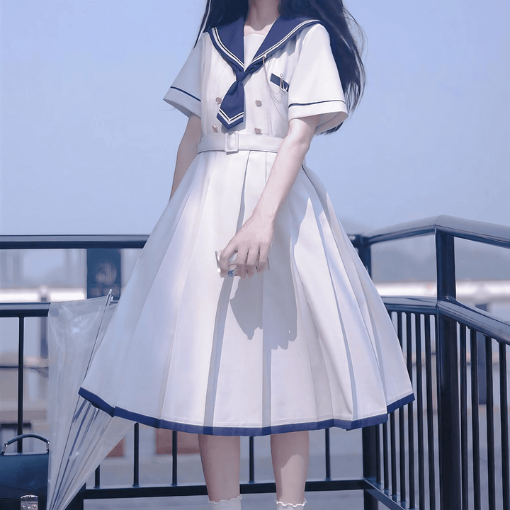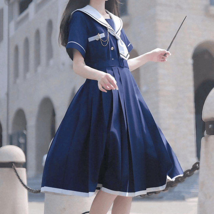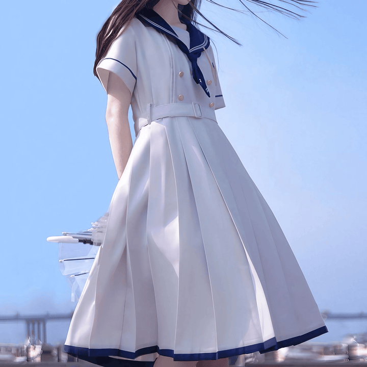 セーラー襟にスカーフ風のリボンを合わせた、爽やかな印象のワンピースです。胸元には金色のボタンを並べ、クラシカルで上品な雰囲気を添えています。ウエストは切り替えデザインになっており、ベルトを合わせることでシルエットをすっきりと見せてくれます。スカート部分はプリーツ加工を施したAラインで、動くたびに軽やかな揺れ感が楽しめる仕上がりです。