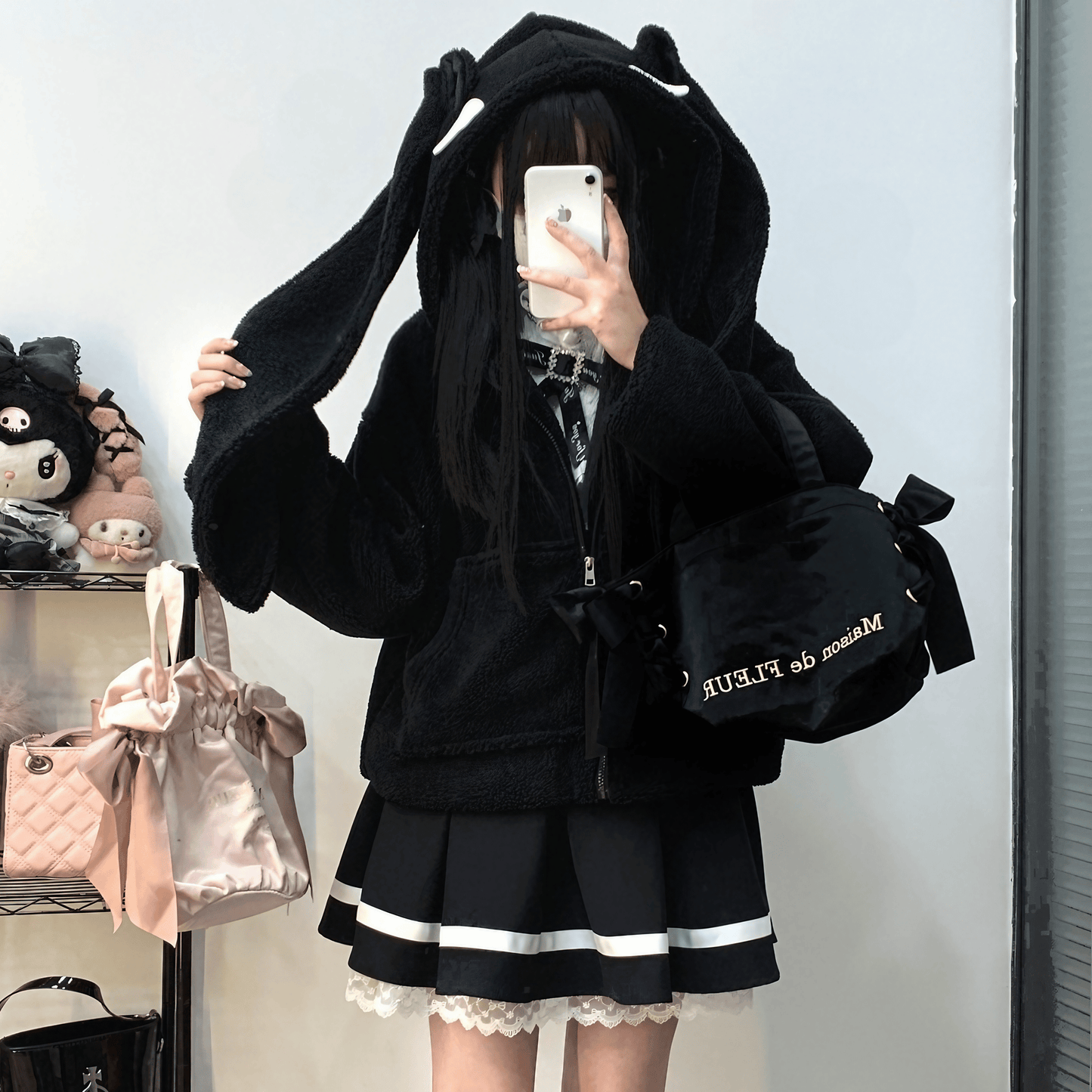 肌触りの良いふわふわ素材のうさ耳付きパーカー。