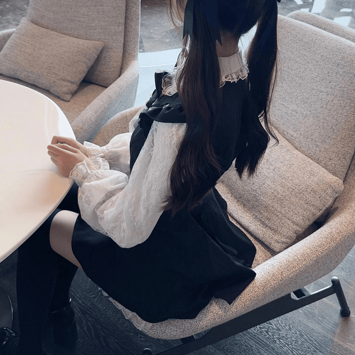 黒を基調としたショートワンピースに、白いレースブラウスを重ねた魅力的な一着です。フロントに並ぶゴールドボタンと胸元のリボン&チャームが、クラシカルなアクセントをプラス。 ふんわりとしたレース袖のブラウスが優雅な雰囲気を演出し、着るだけで甘さと上品さが引き立つデザインは、特別な日のおしゃれにも、日常のコーディネートにもぴったり。 量産型や地雷系コーデを楽しむ方にもおすすめのアイテムです!