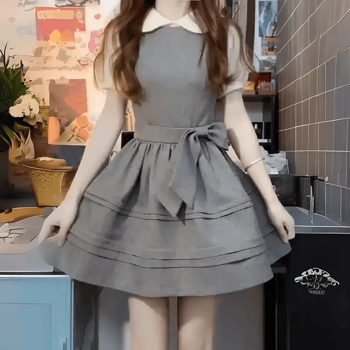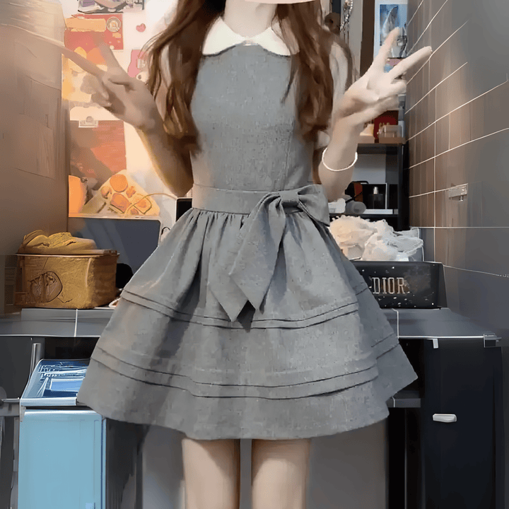 丸襟ブラウスとリボンジャンスカが奏でる、上品クラシカルなスクール風セット 丸襟が可愛い白ブラウスに、ウエストリボンがポイントのグレーのジャンパースカートを合わせた、清楚で上品なスクール風セットアップ。ふんわり広がるAラインのスカートが、歩くたびに軽やかに揺れてフェミニンな雰囲気を演出します。 ジャンスカのウエストリボンは、可愛さだけでなくスタイルアップ効果も◎シンプルながらも裾のラインデザインや丸襟など、細部にこだわったデザインが魅力です。落ち着いたグレーカラーで甘すぎず、大人っぽいガーリースタイルが楽しめます。
