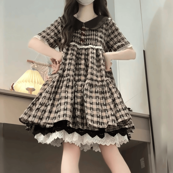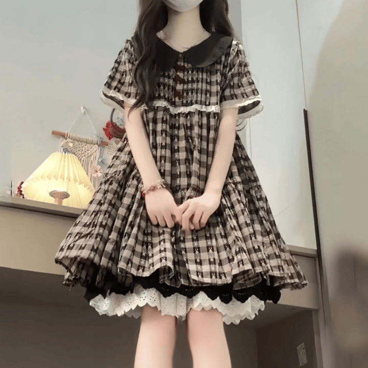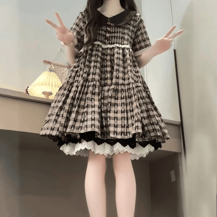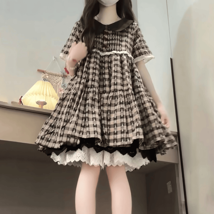 レトロなチェック柄に、大きめのセーラー風襟がアクセントになった、ゆったりシルエットのガーリーワンピース。