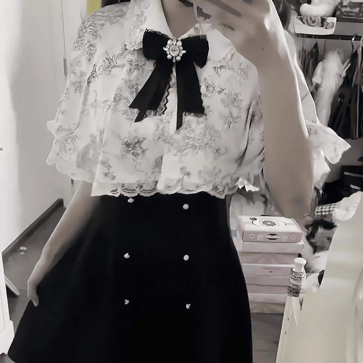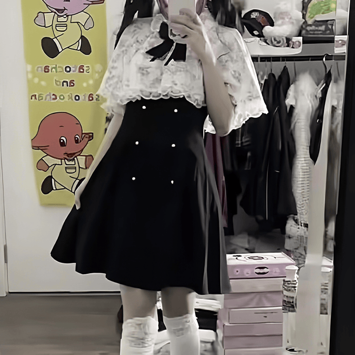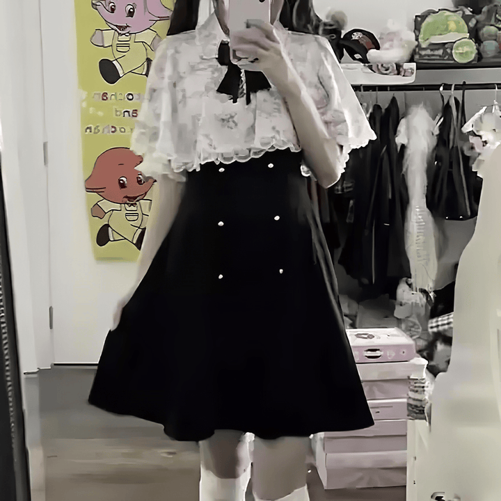 花柄のレースケープに、胸元のリボンがアクセントになった甘めデザインが魅力。ふんわりと肩にかかるレースが上半身を華やかに彩り、透け感のある素材が軽やかさも演出します。 シンプルなブラックのAラインワンピースはウエストにフィットしてスタイルアップ効果も◎ フロントには小さな装飾ボタンが並び、さりげないアクセントに。ガーリーな世界観を存分に楽しめる一着です。