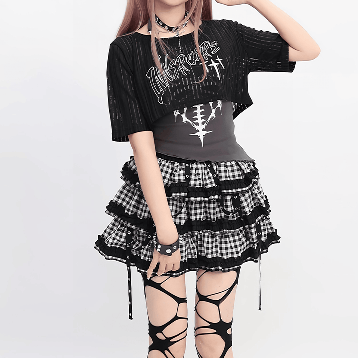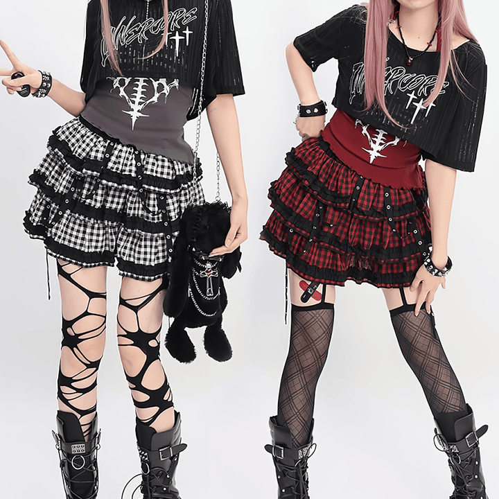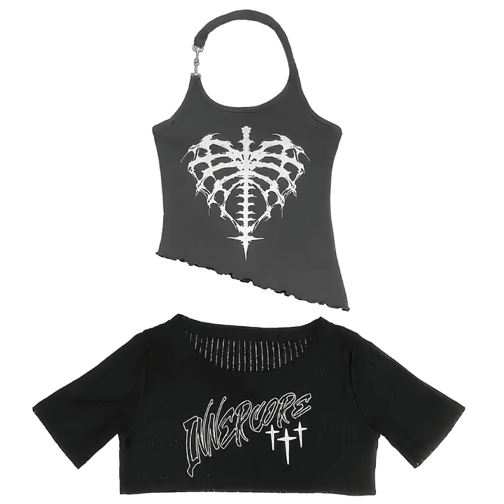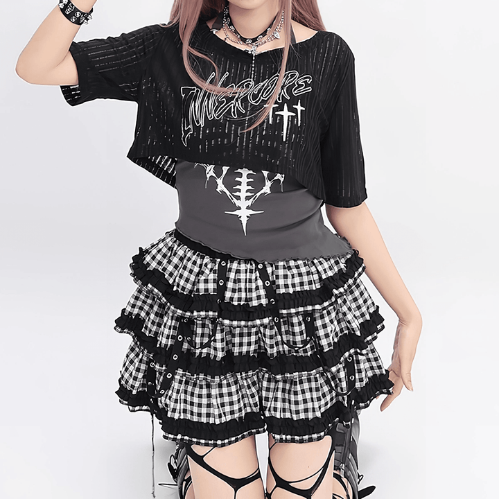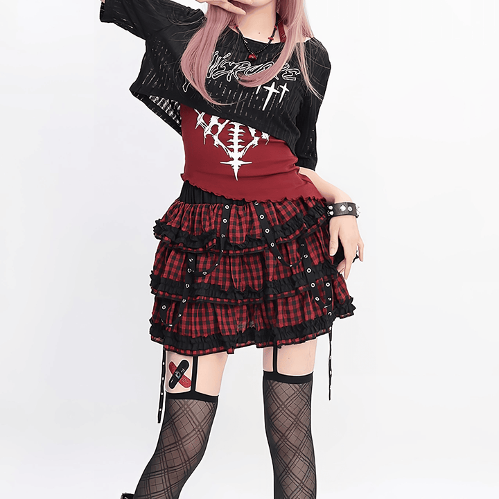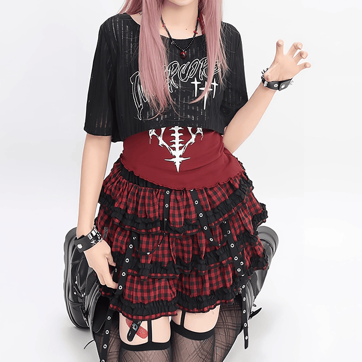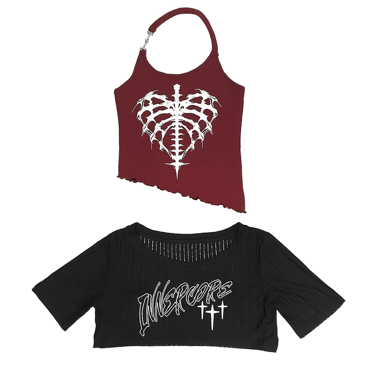 アウターのブラックTシャツには英字ロゴとクロスモチーフ、インナーにはスカルでデザインされたハートがプリントされ、ひと味違う存在感を演出します。 インナーはアシメ感のあるシルエットが可愛く、サブカル感も漂うアイテム。カラーは黒と赤の2タイプで、コーデの雰囲気に合わせて選べます。地雷系・パンク・サブカル女子のワードローブにぴったりです。