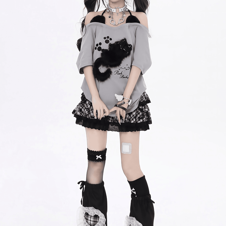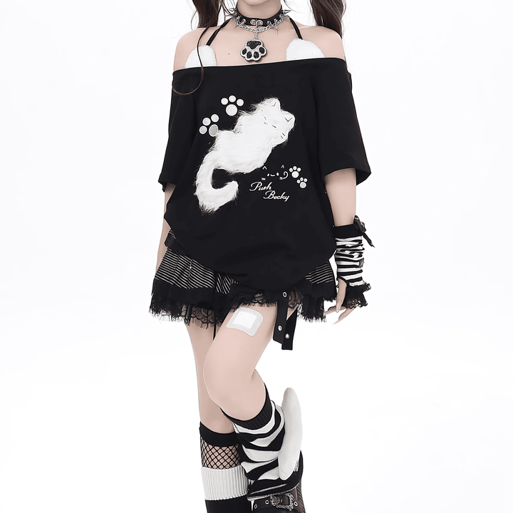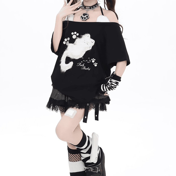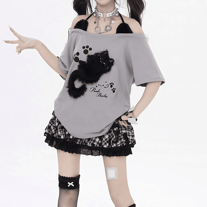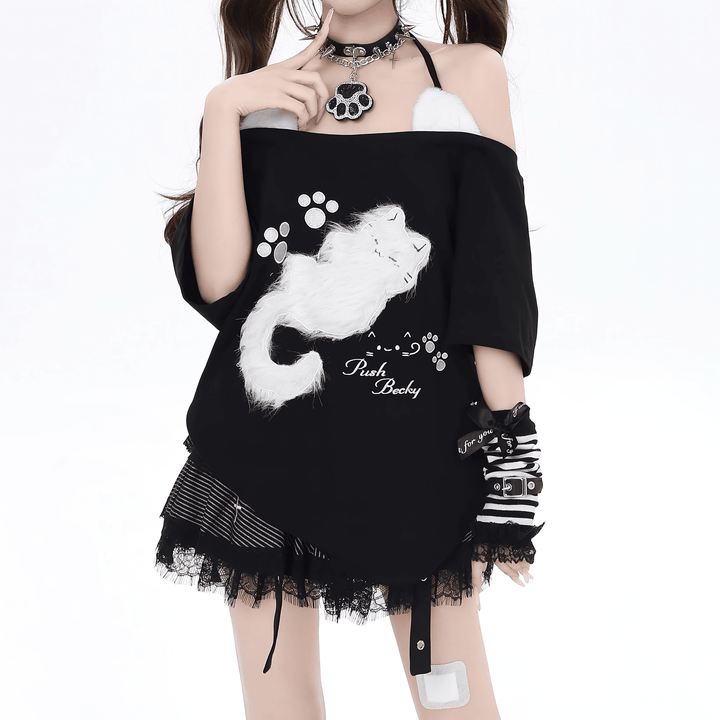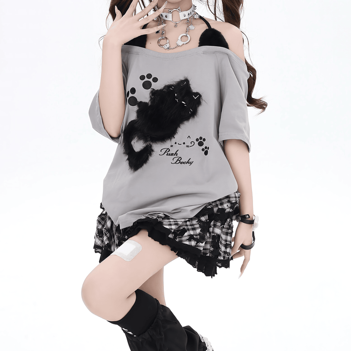 大胆に肩を落としたオフショルダーのデザインと、胸元の立体的な猫のアップリケが特徴のガーリーTシャツ。