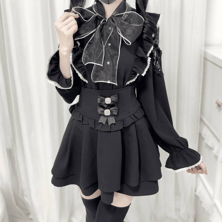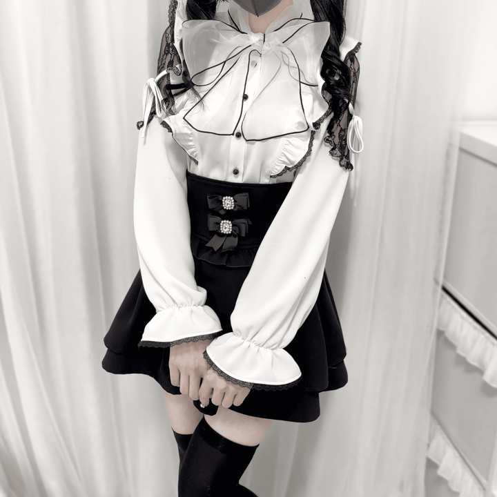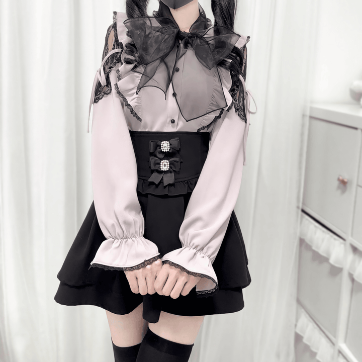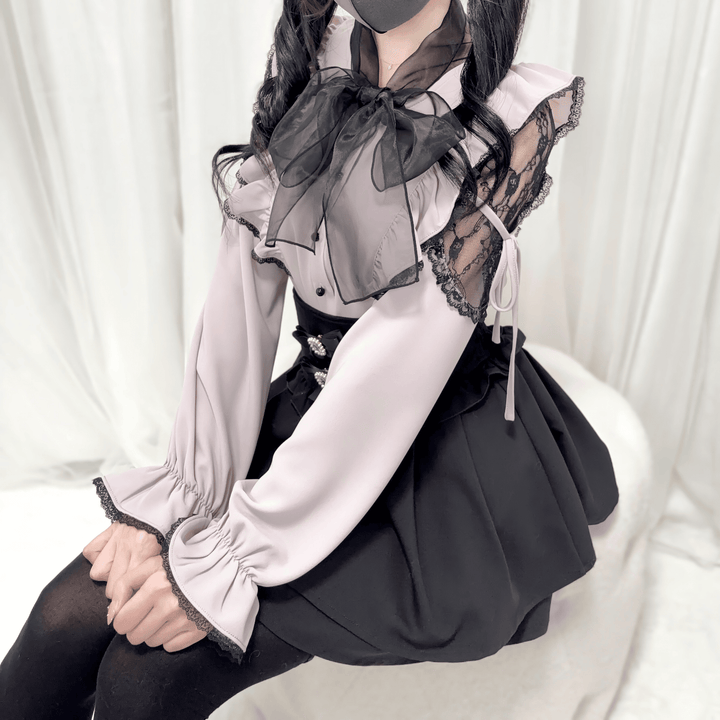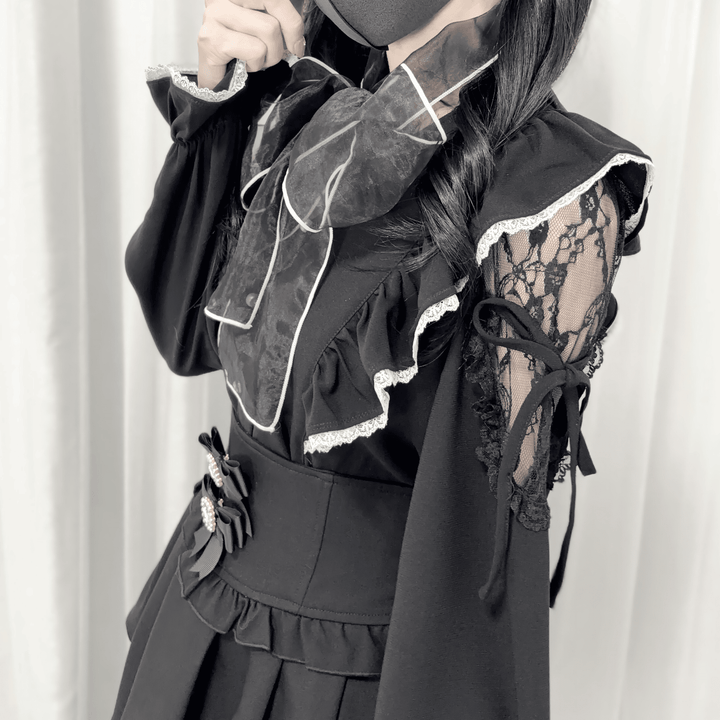 肩はオープンショルダーになっていて、さりげない肌見せが叶います。フリルたっぷりのスリーブや袖のリボン、黒レースの縁取りなど、細部までこだわったデザインが魅力です。