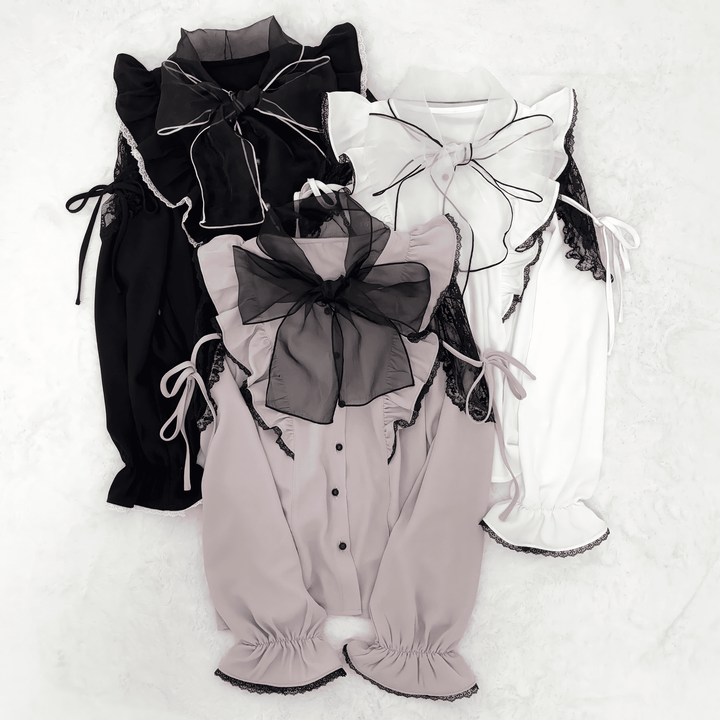 透け感のある特大リボンが胸元でひときわ目を引くガーリーブラウス。