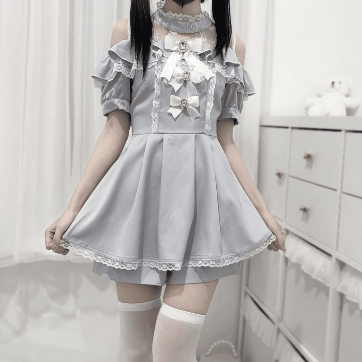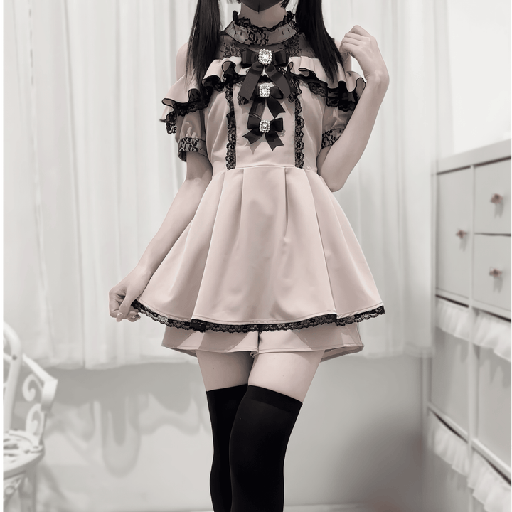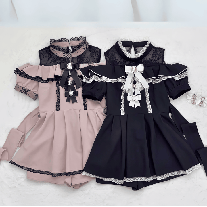 胸元には輝くビジュ―がついたリボンが3連で並び、特別感のある華やかさを演出。袖や裾にはフリルとレースの縁取りが施され、甘さとクラシカルな雰囲気が漂います。 ボトムは一見スカートに見えるキュロットタイプで、動きやすさも抜群。リボンベルト付きで、後ろ姿もぬかりない可愛さに。