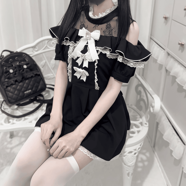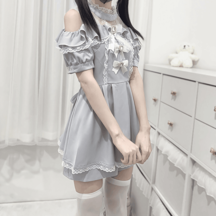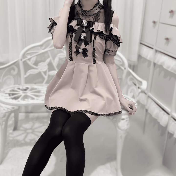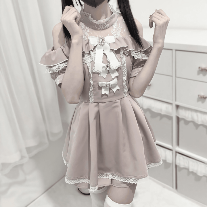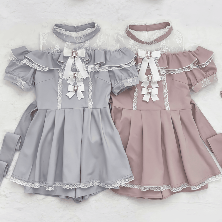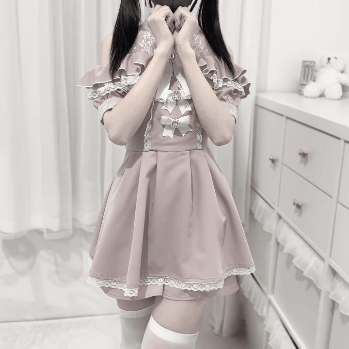 ビジュ―付きリボンとレースの甘さが詰まった、肩出しデザインの華やかセットアップ