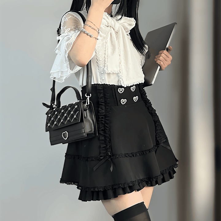 繊細なレースで切り替えられた肩の透け感が可愛らしく、涼しげな印象を与えてくれる半袖ブラウスです。大きなリボンタイが目を引き、顔まわりを華やかに演出。袖は二段フリル仕様で、ふんわりと広がるシルエットがフェミニンな雰囲気を高めます。フロントにはレースやピンタックがあしらわれており、甘さと上品さを兼ね備えたデザインに仕上がっています。