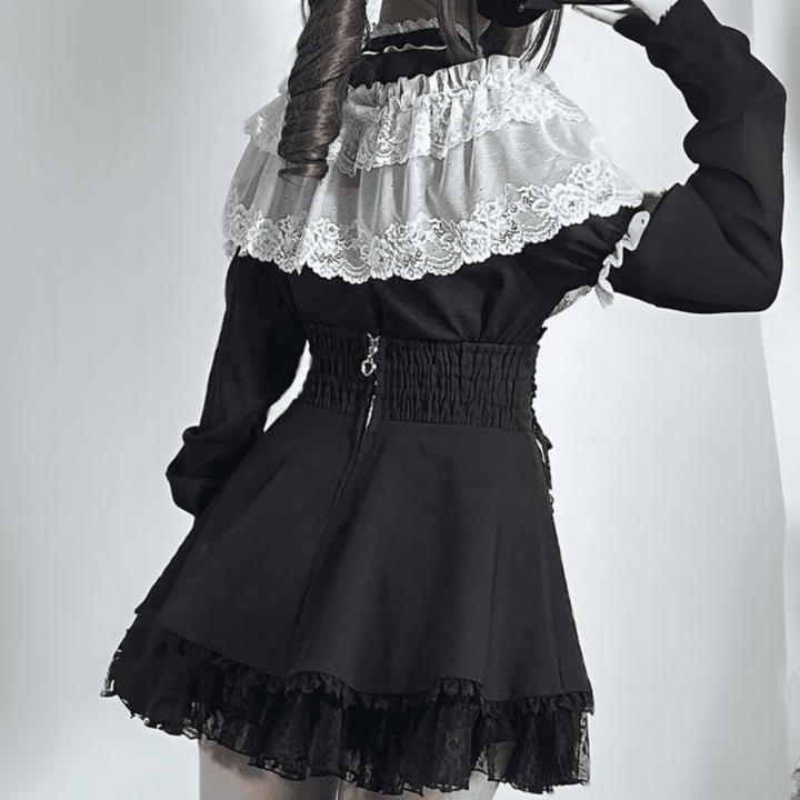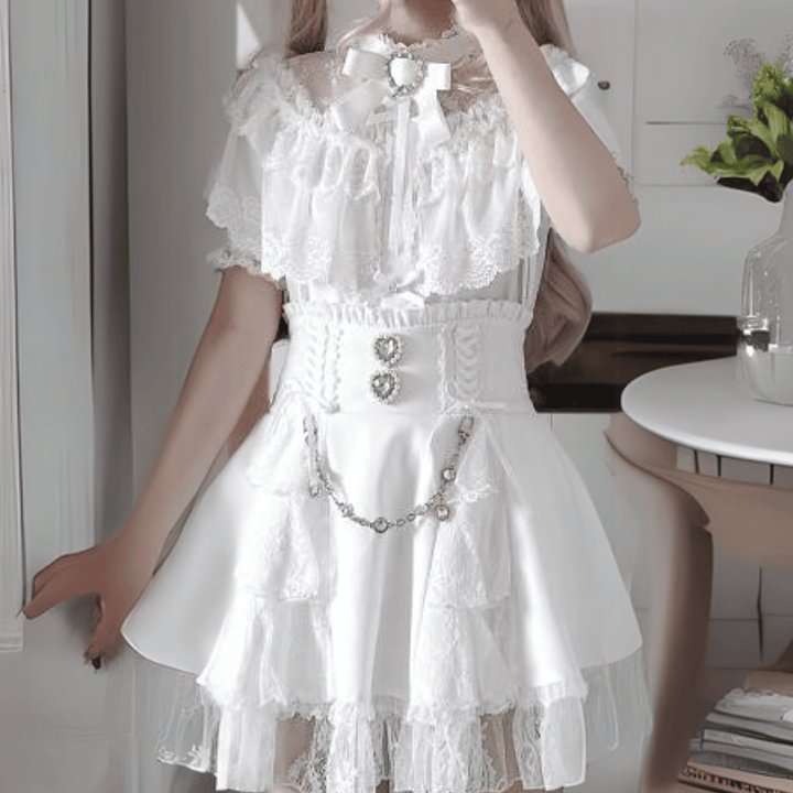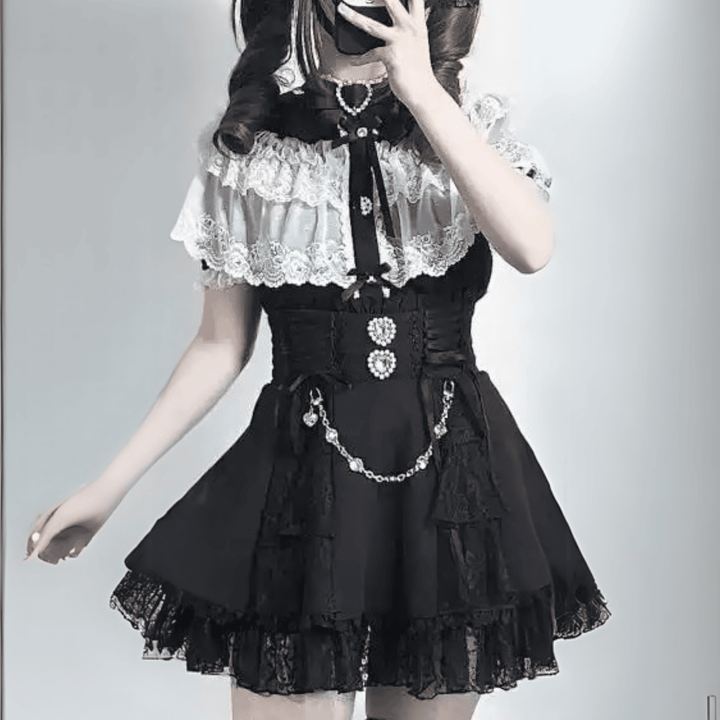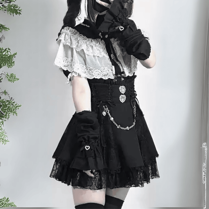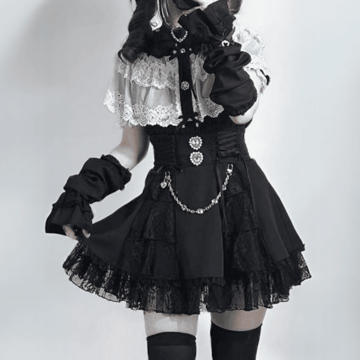 繊細なレースが贅沢に重なったケープデザインが特徴の、甘くゴシックな雰囲気漂うブラウスです。首元にはビジューボタンとリボンが施され、上品な可愛らしさを演出。袖は短袖と長袖の2WAY仕様で、気分や季節に合わせて着回せます。