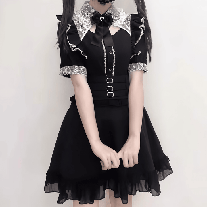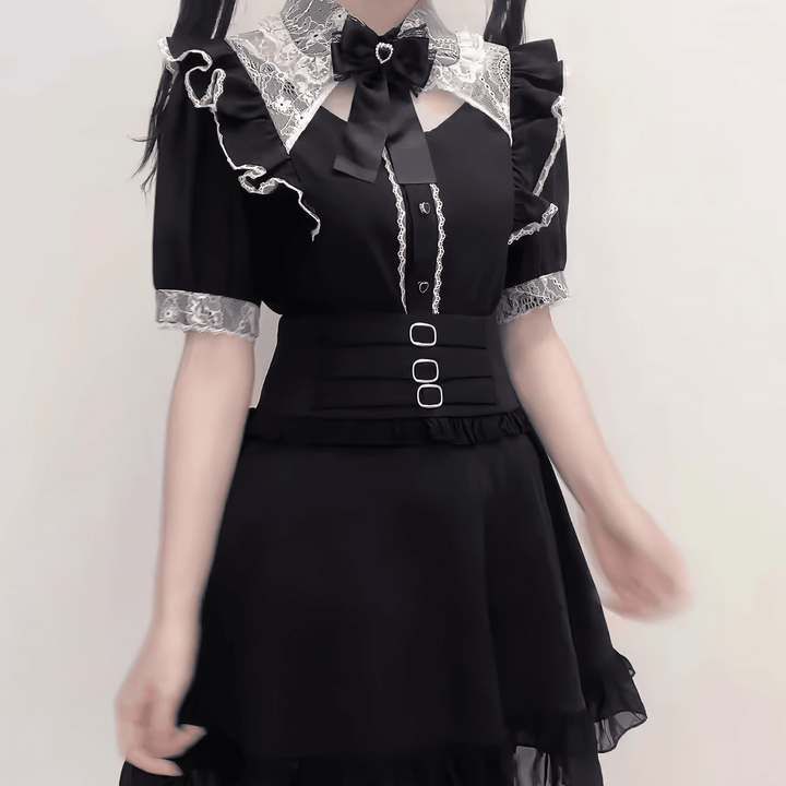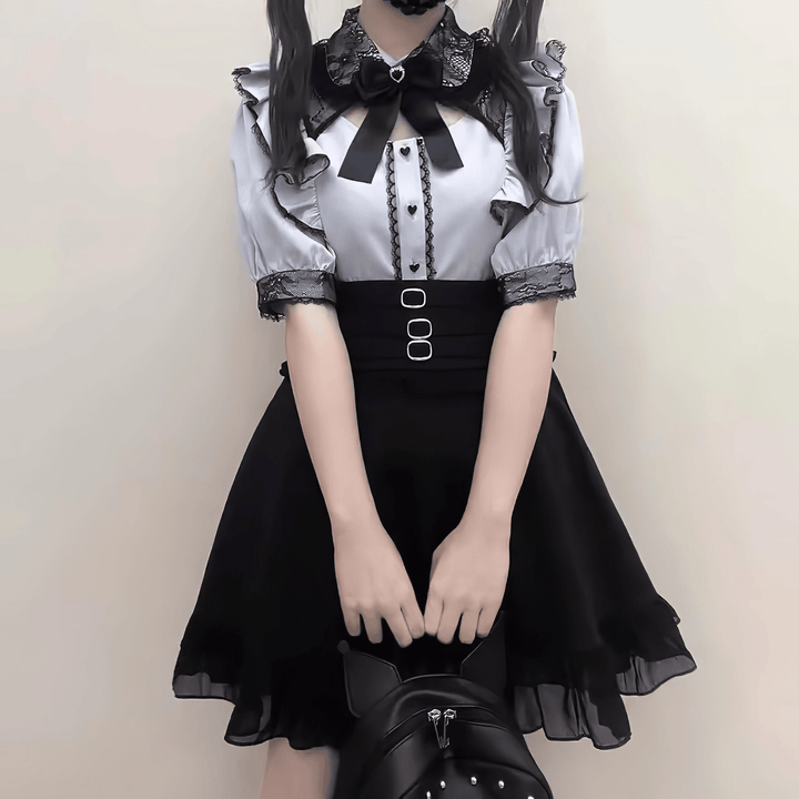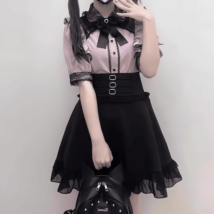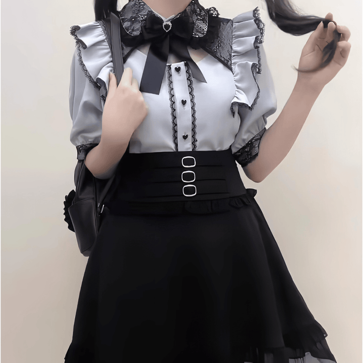大きな黒リボンとハート型チャームがポイントのブラウスは、袖と前立てに繊細なレースがあしらわれたデザイン。ふんわりとしたパフスリーブや立体感のあるフリルが、甘さの中に個性をプラスします。ハイウエストのフレアスカートは、ウエストの三連バックルが視線を引き締めてくれ、くびれラインを美しく見せてくれる仕様。