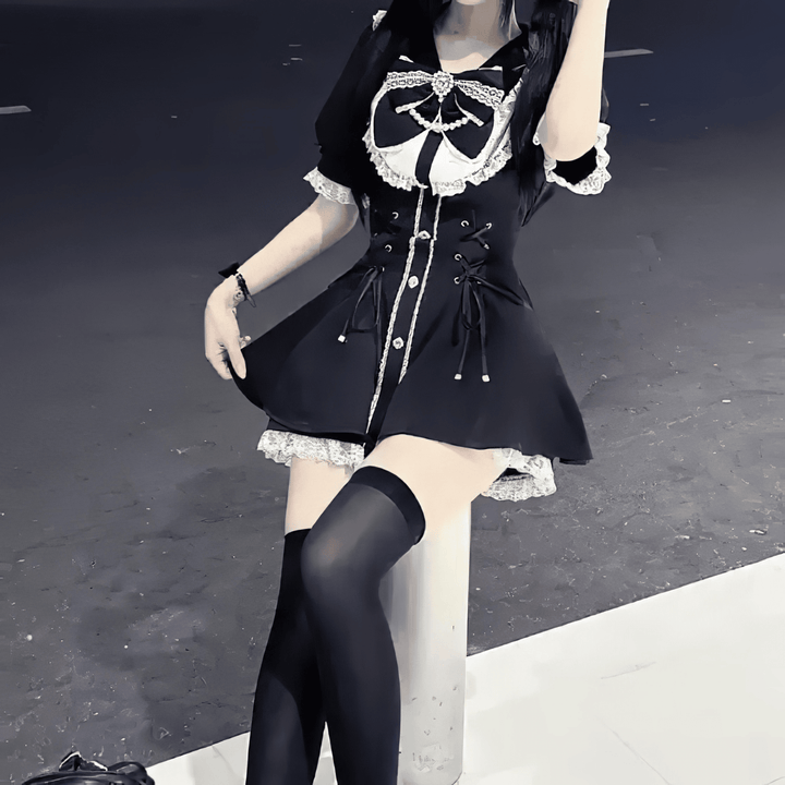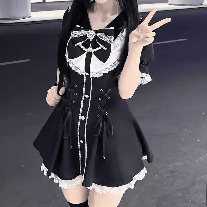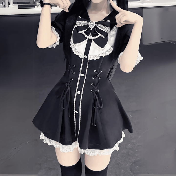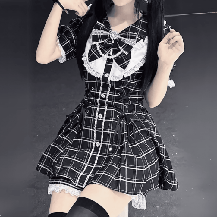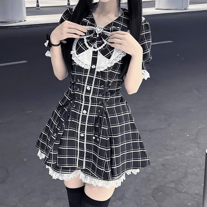 スカートはAラインに広がり、裾にレースを施して可愛らしさを引き立てています。黒地にホワイトのチェックとレース装飾が映えるデザインで、ゴシック要素と清楚感を兼ね備えた一着です。日常コーデから特別なお出かけまで、幅広く活躍してくれます。