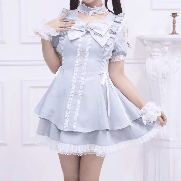 縦ラインのレースとパールボタン、大ぶりのビジュー付きリボンが目を引くデザインで、甘さとエレガントさを両立。サイドのレースアップでウエスト調整もでき、シルエットを自分好みにアレンジ可能です。裾の二重フレアスカートにはレースが施されていて、歩くたびにふんわりと揺れ、まるでお人形のような佇まいです。
