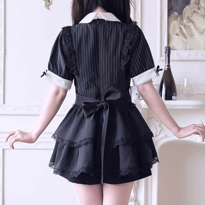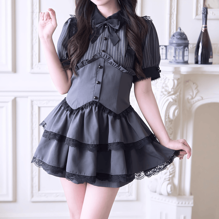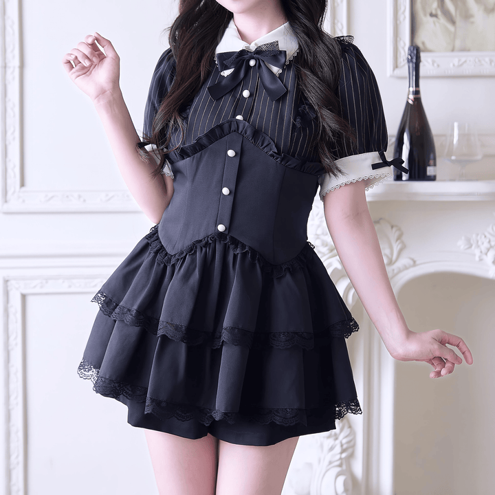 クラシカルな雰囲気をまとったストライプブラウスと、動きやすさも嬉しい3段フリルのショートパンツがセットになったセットアップ。トップスはコルセット風切り替えとフロントフリルが上品で、首元には大きめリボンをあしらい、可愛さと大人っぽさの絶妙なバランスに。