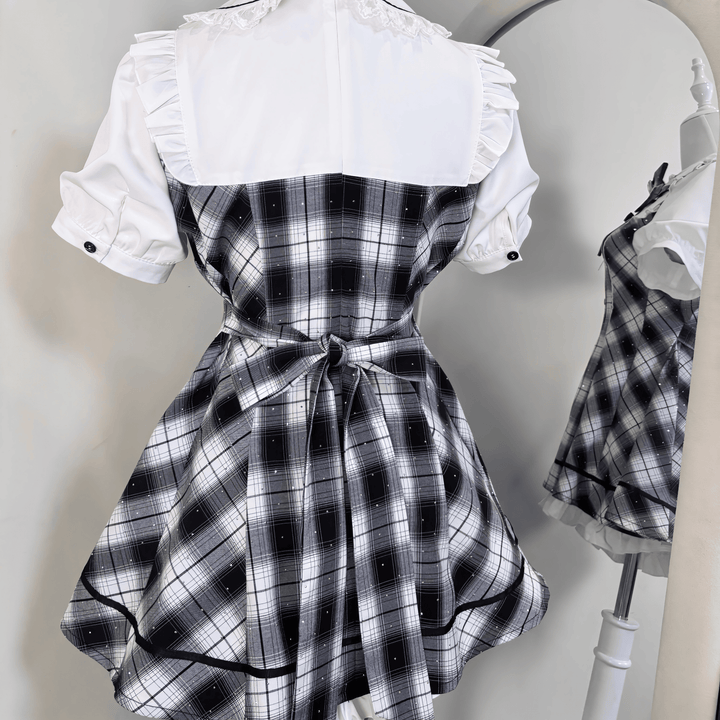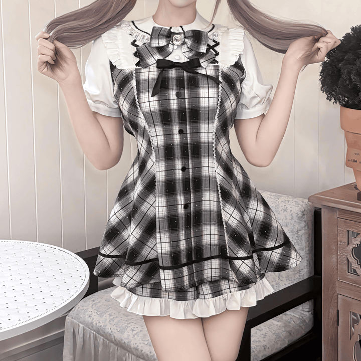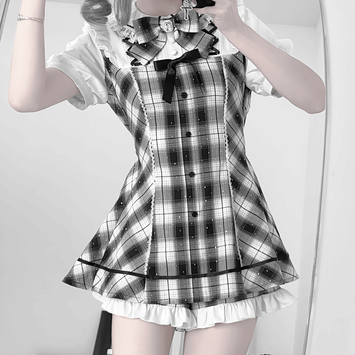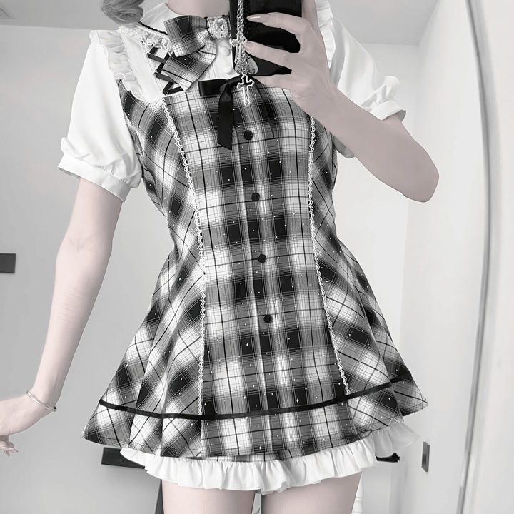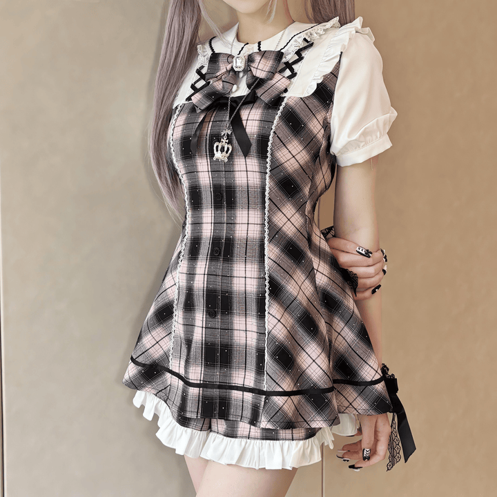 フロントには縦に並んだボタンとレース、ウエストラインの切り替えとフリルがスタイルアップ効果を引き立て、細部までこだわりのデザインが詰まっています。カラーバリエーションは、大人かわいい白黒チェックと、儚げで甘いピンクチェック。日常コーデに少しサブカル感をプラスしたい時にもぴったりの1着です。
