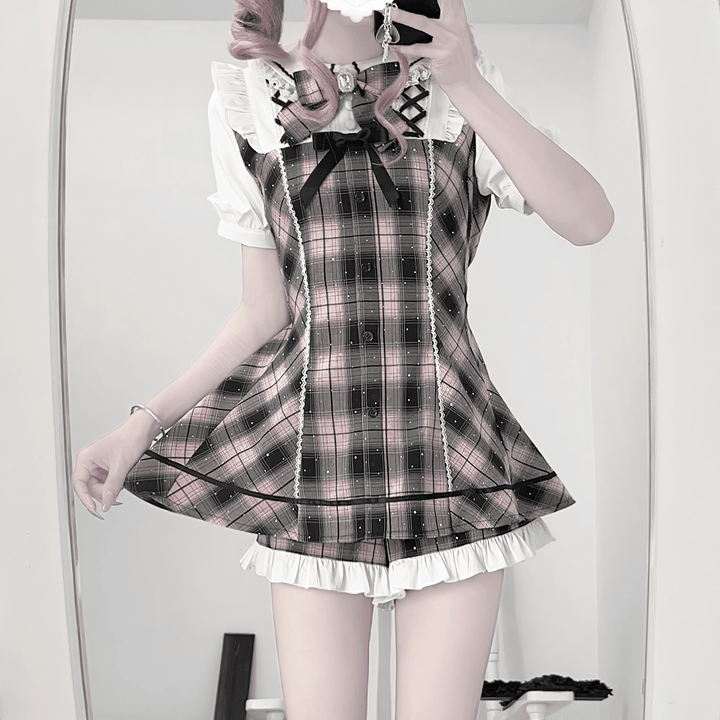 【BunnyRush】ビジューxフリルパンツチェックセットアップ◆セットアップ 地雷系 S、M、L、XL
