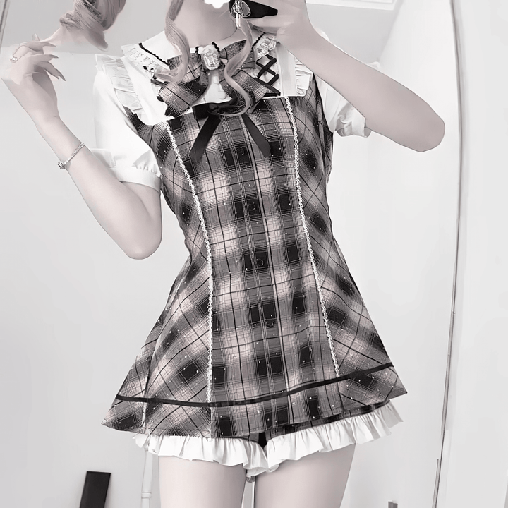 胸元のビジュー付きリボンと黒リボンが印象的なこちらのセットアップは、チェック柄トップスとフリル付きショートパンツの2点セット。ワンピースのような見た目ながら、実は動きやすいショートパンツ仕様になっているため、ガーリーコーデも快適に楽しめます。