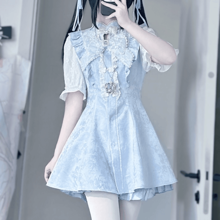 大きなリボンとチャイナ風ボタン、パール調アクセサリーが印象的な夏にぴったりの半袖セットアップ。胸元の装飾とウエストの切り替えでスタイルアップ効果もあり、フレアに広がるシルエットが美しいラインを演出します。