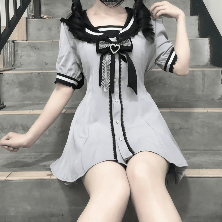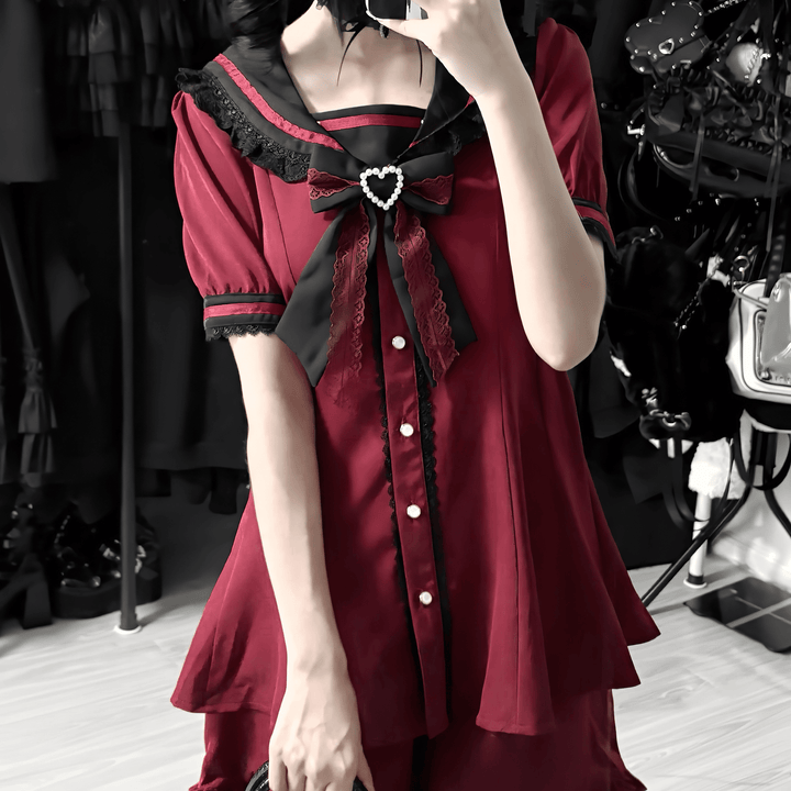 フロントのパールボタンや胸元の大きなリボン、レースの装飾が女の子らしさを引き立てる、甘さたっぷりの地雷系セットアップ。トップスはセーラーカラー風のデザインで、フリルやレースが華やかさをプラス。