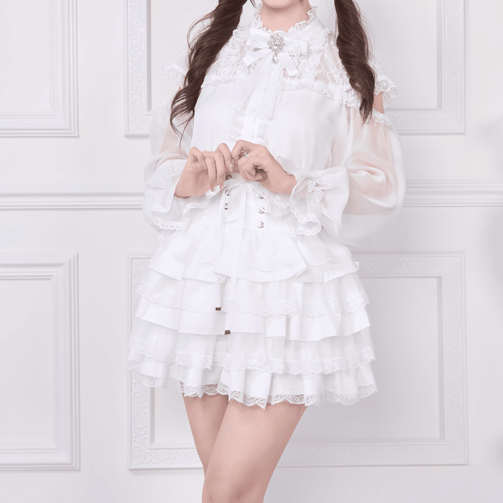 胸元や肩にあしらわれたレースとフリルが華やかに広がり、クラシカルな印象を与えるシフォンブラウスです。首元にはリボンと飾りを添えて可憐さを演出し、透け感のある長袖はふんわりとしたシルエットで軽やかに仕上げられています。袖口にはレースフリルが重なり、動きに合わせて柔らかに揺れるのも魅力です。