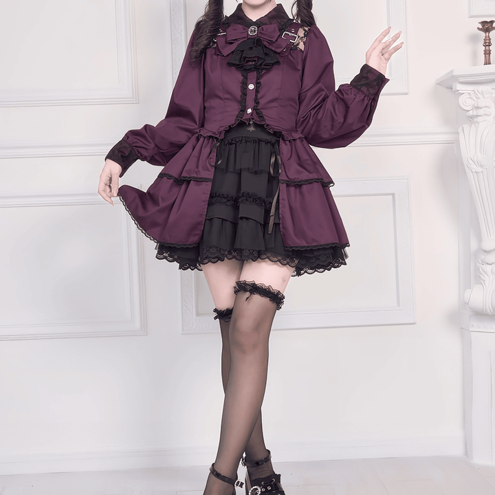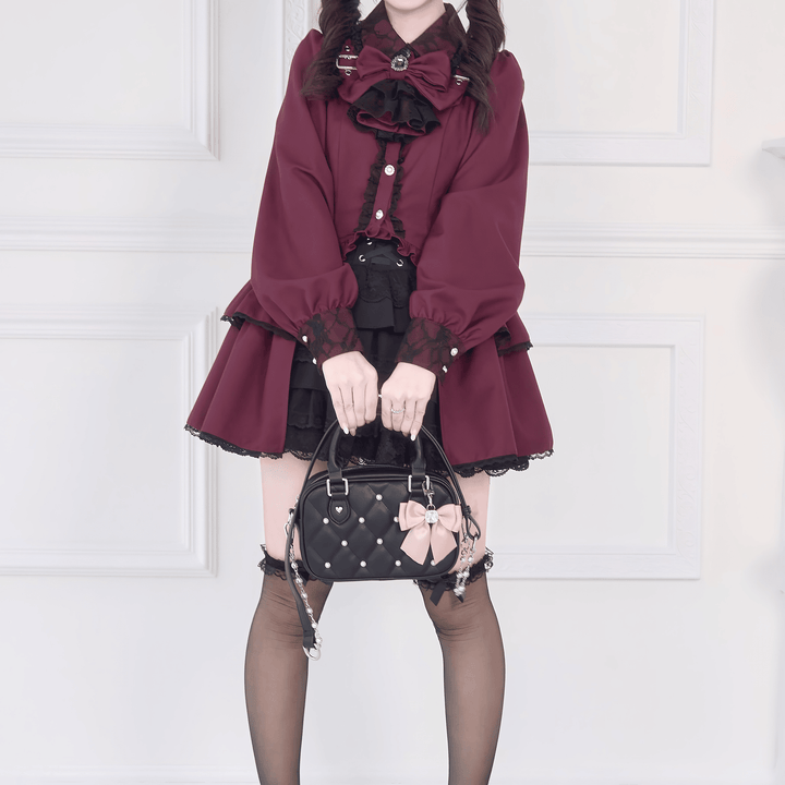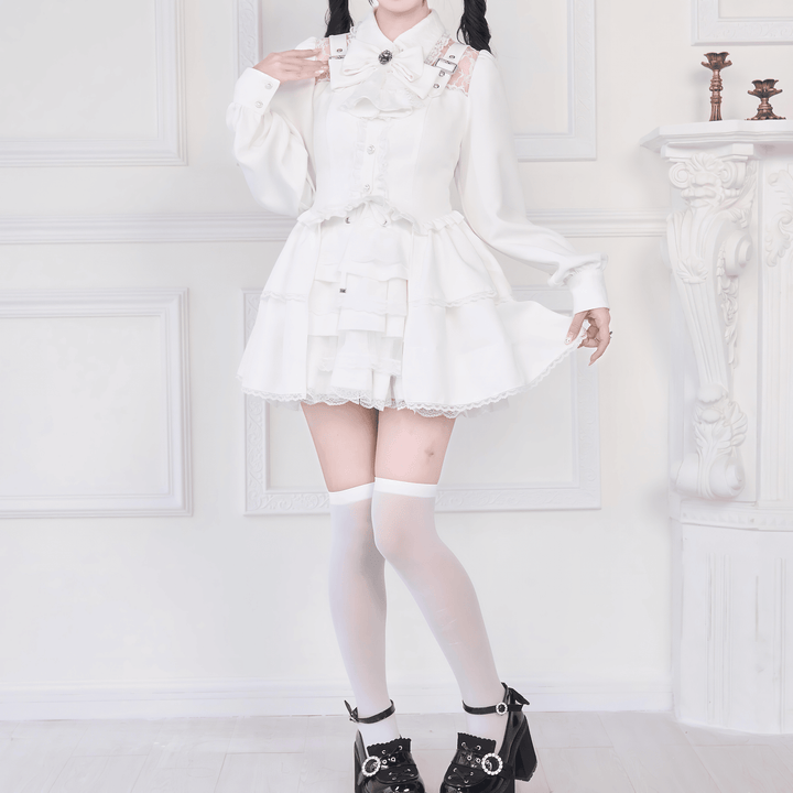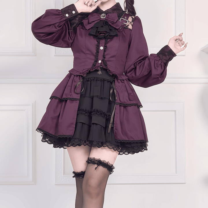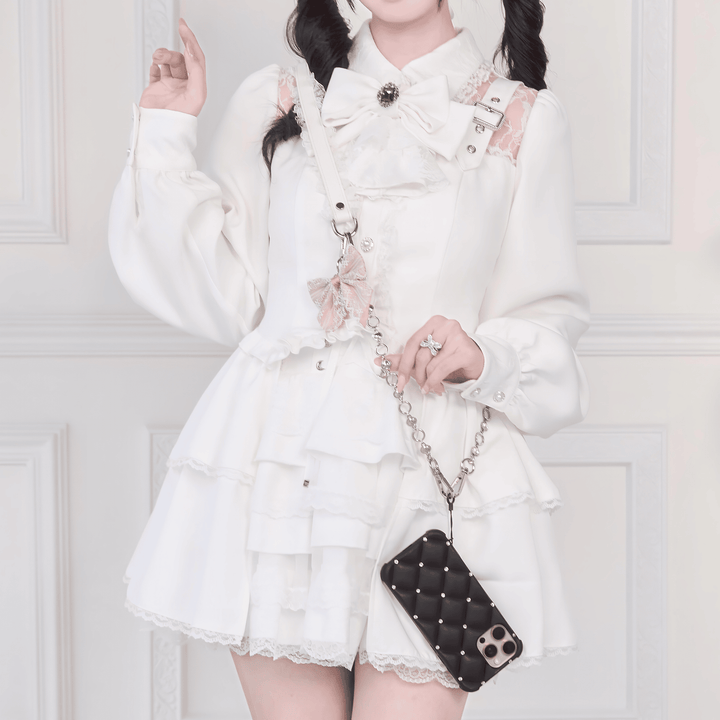 胸元に重ねられた大きなリボンとフリルが目を引く、存在感のあるロング丈ブラウスです。裾にかけてゆるやかに広がるシルエットは軽やかで、甘さと気品を兼ね備えています。肩に施された装飾がアクセントとなり、クラシカルな雰囲気をより引き立てています。袖はボリュームのある形で、袖口をカフスでまとめることで全体にバランスの取れた印象に仕上がっています。