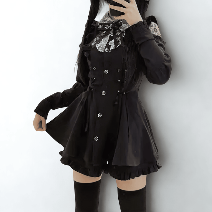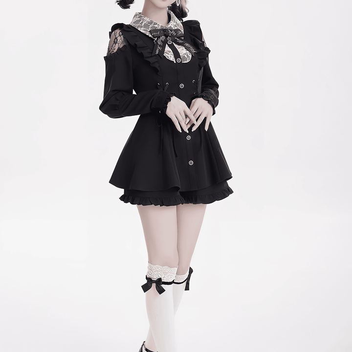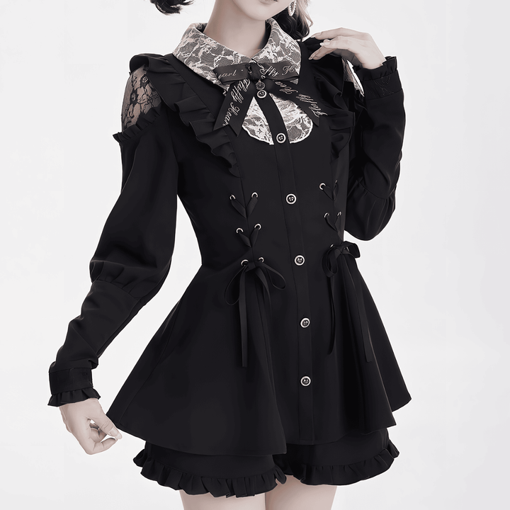 黒を基調にしたトップスとショートパンツの2点セットです。トップスはフロントにボタンを配し、ウエスト部分にレースアップ風のリボンを取り入れたデザインで、シルエットをすっきり見せながら装飾性も高めています。襟にはレースを重ね、大きなリボンを添えることで華やかで印象的なアクセントになっています。