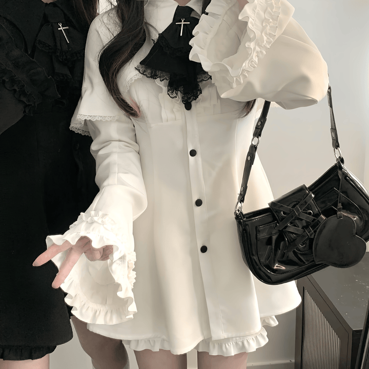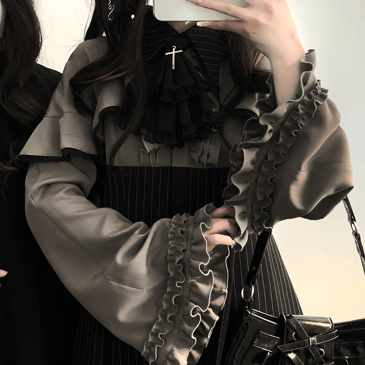 重ね着したようなデザインでフリルをたっぷりあしらったワンピースです。襟元から胸元にかけて大きめのフリルが広がり、立体感のある甘い表情をつくります。袖全体には細かなフリルが縦に流れ、手元へ向かうほど柔らかな広がりが生まれています。胸元のボタンやリボン使いにより、華やかさが程よく加わりながらまとまりのある印象に仕上がっています。