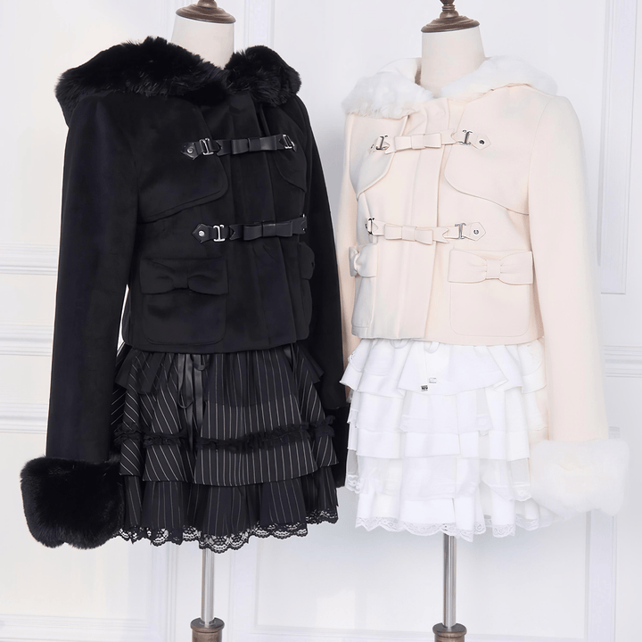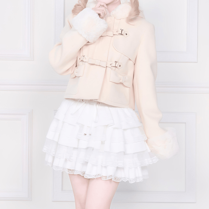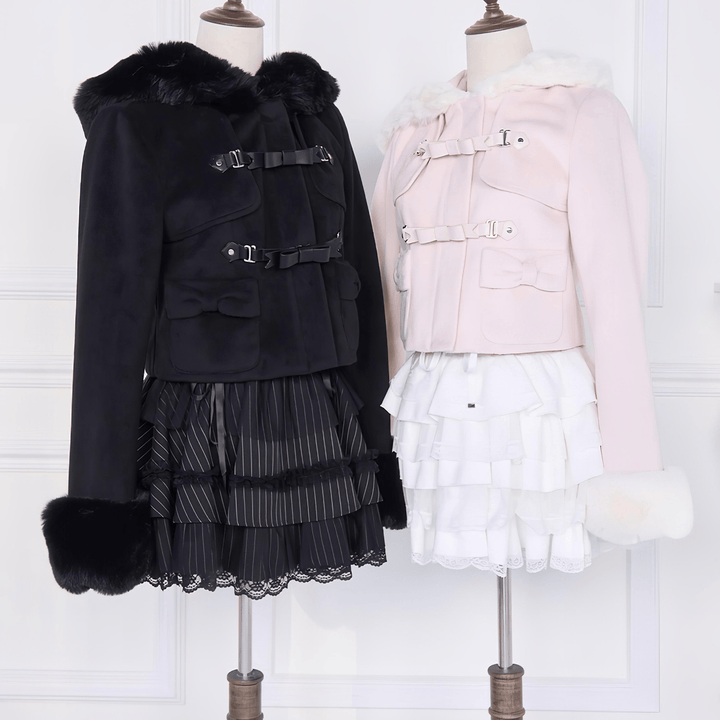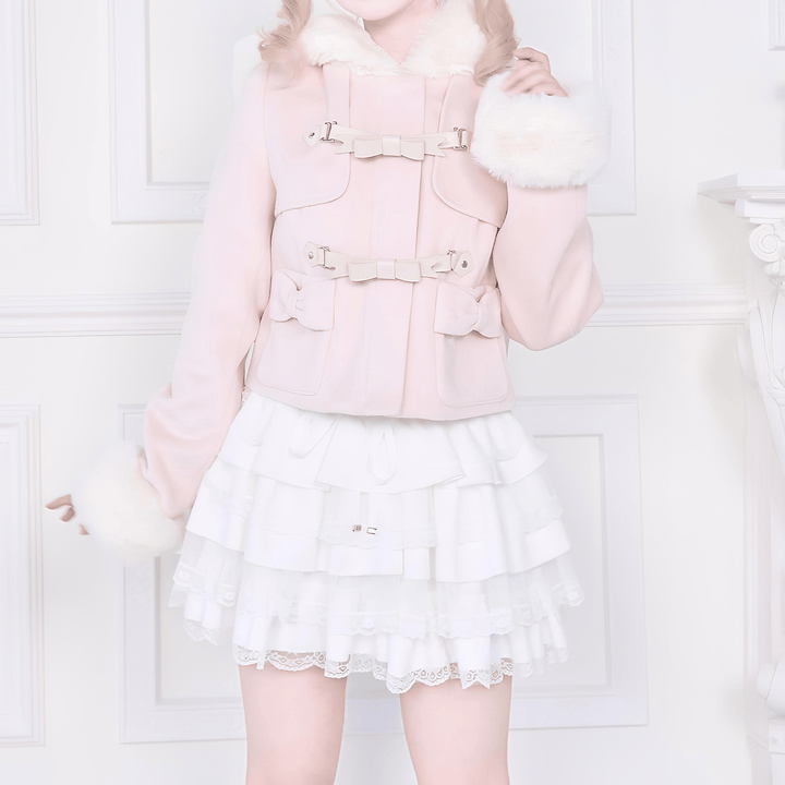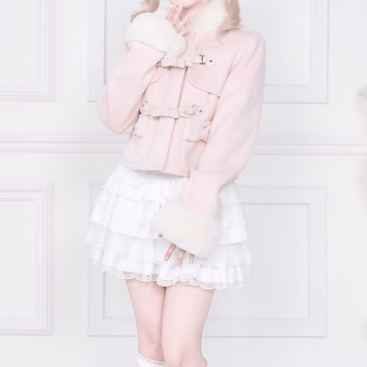 フードまわりと袖口にあしらわれた柔らかなファーが印象的なショート丈ジャケットです。前面の二段のリボン型のバックルベルトで、デザイン性と存在感を添えています。ポケットの小さなリボンが甘さをやさしく加えています。黒は全体を落ち着いた雰囲気に整え、淡いトーンは明るく軽やかな印象になります。